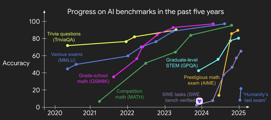 - 即便我们设定更难的基准,很快(而且会越来越快)它们也会被这种套路解决。我的同事杰森·韦伊制作了一张精美的图表,很好地展现了这一趋势: